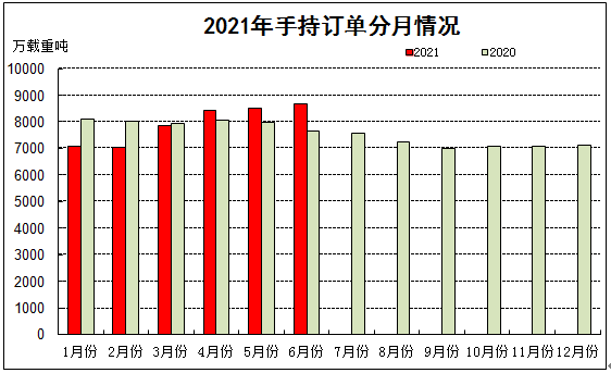 2021年上半年,全国造船完工量2092万载重吨,同比增长19.0%;承接新船订单量3824万载重吨,同比增长206.8%。截至6月底,手持船舶订单量8660万载重吨,同比增长13.1%,比2020年底手持订单增长21.8%。