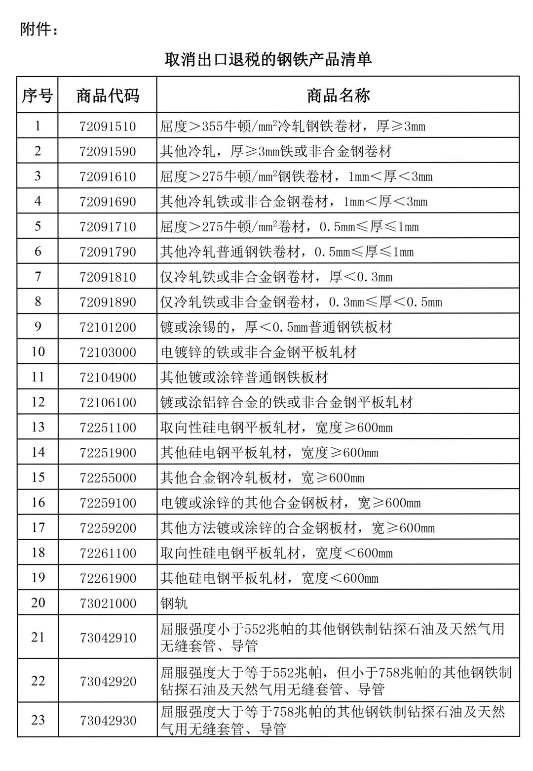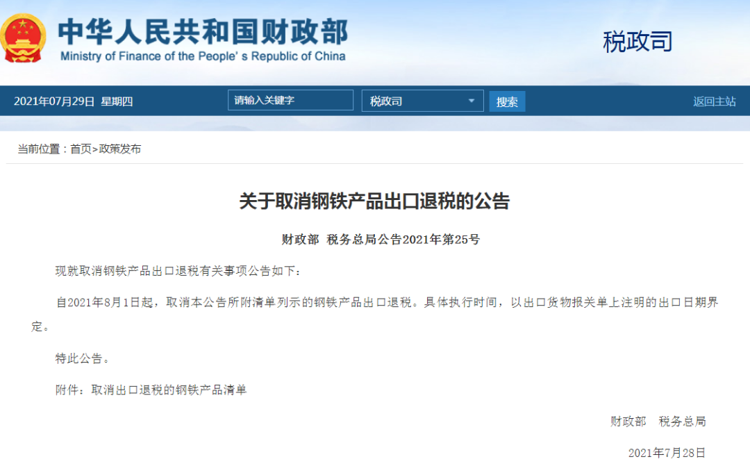 7月28日,财政部发布了《关于取消钢铁产品出口退税的公告》。自2021年8月1日起,取消公告所附清单列示的钢铁产品出口退税。具体执行时间,以出口货物报关单上注明的出口日期界定。其中,涉及23个钢铁产品的税则号。