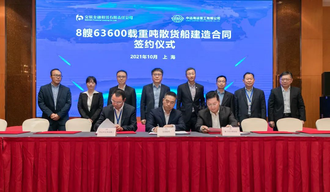 10月16日,舟山中远海运重工与交银金融租赁在上海签署了8艘63600载重吨散货船建造合同。