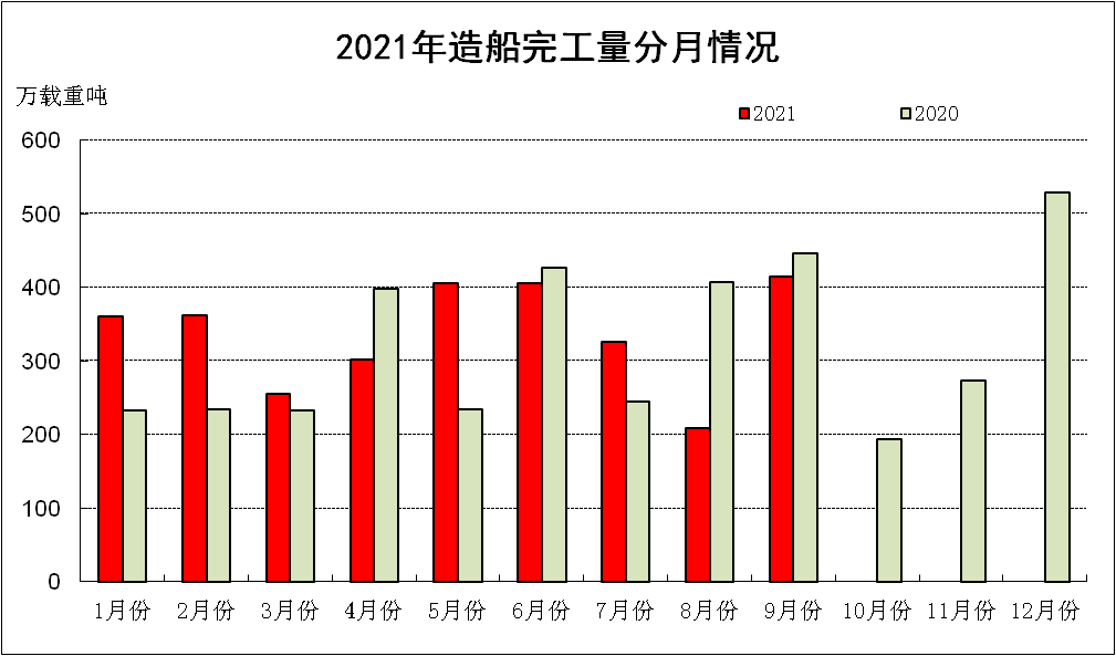 1~9月份,全国造船完工3034万载重吨,同比增长6.2%。承接新船订单5416万载重吨,同比增长223.3%。9月底,手持船舶订单9244万载重吨,同比增长32.3%,比2020年底手持订单增长30.0%。