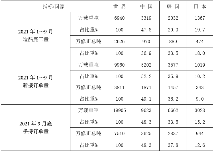 2021年1~9月份世界造船三大指标