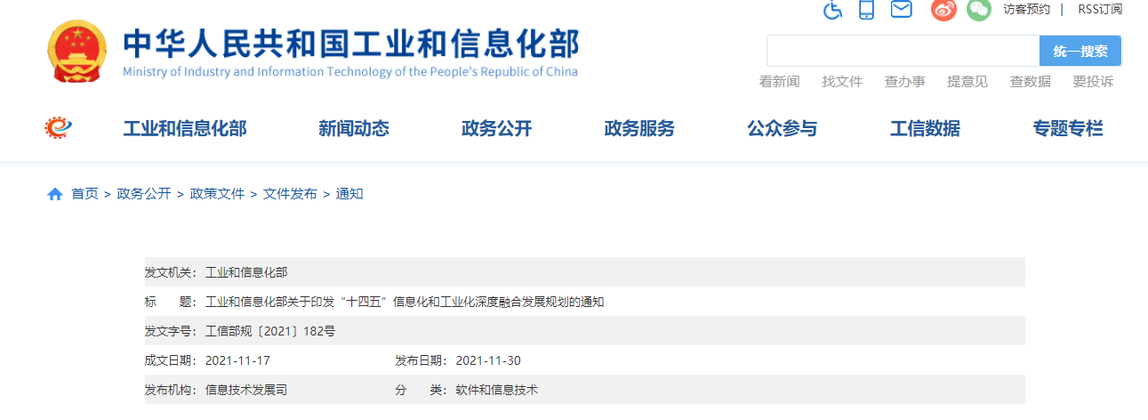 工信部发布《“十四五”信息化和工业化深度融合发展规划》
