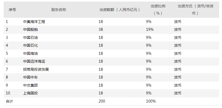 中国海工技术公司背靠央企国企。根据公告,中国船舶出资金额最高,为38亿元,占合资公司19%的股份,出资方式为货币出资;中集海洋工程及其他参股公司均出资18亿元,各占合资公司9%的股份,出资方式为货币出资。