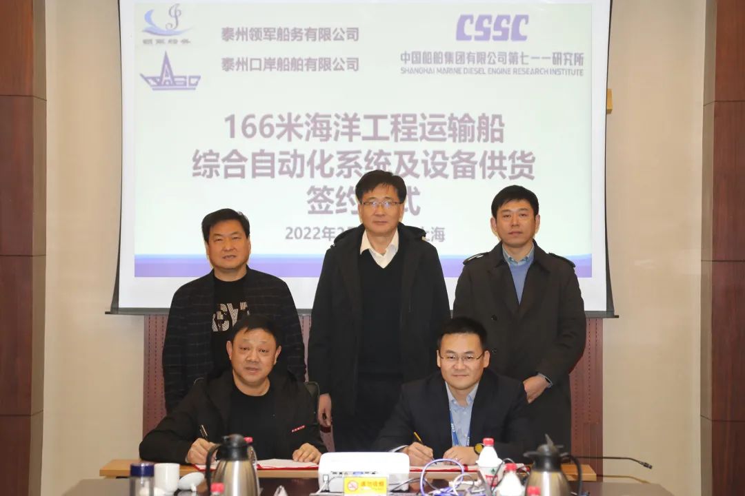 近日,中国船舶集团上海船用柴油机研究所与泰州领军船务有限公司举行166M海洋工程运输船综合自动化系统及设备供货合同签约仪式。该船将服务于海上风电大部件运输业务,为海上风电建设提供支撑。
