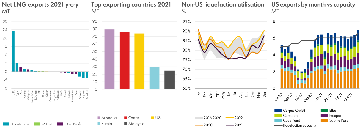在供给方面,2021年,LNG出口量位居前三位的仍然是澳大利亚、卡塔尔和美国。特别值得一提的是,去年美国LNG出口增量位居世界第一,同比增长2400万吨,达到7360万吨,专家预计2022年美国有望超过澳大利亚成为全球最大的LNG出口国。