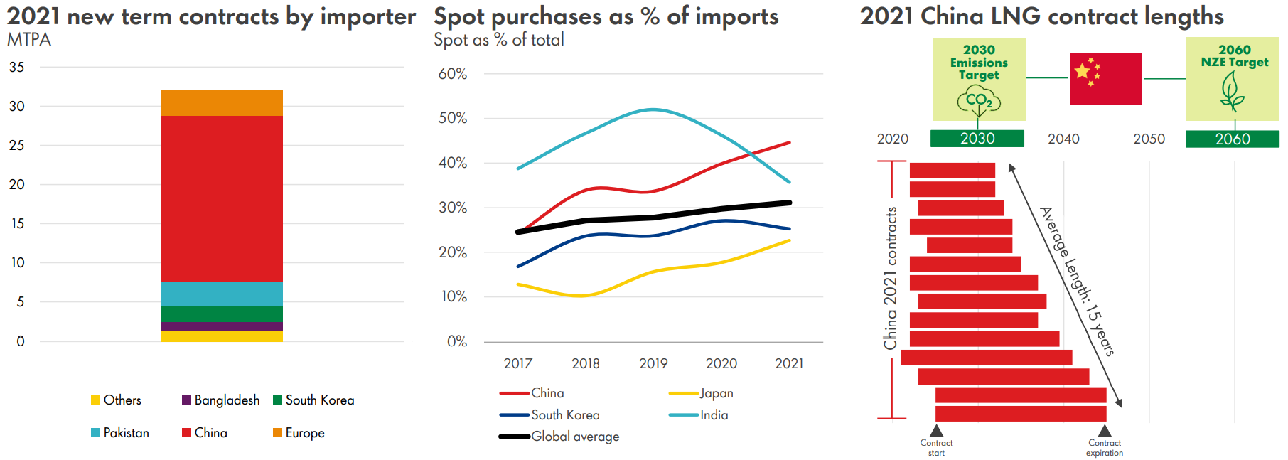 2021年,中国的LNG买家签署了每年超过2000万吨的长期合同。这表明LNG在关键行业用能的煤改气转型, 以及助力中国实现2060年碳中和目标过程中将持续发挥作用。