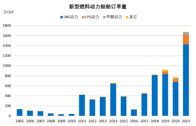 三是从燃料类型上充分体现了新燃料船舶在新周期中的重要地位。在全球航运业温室气体减排战略的推动下,新燃料船舶得到市场的极大关注。特别是新冠疫情以来,围绕新燃料动力船舶的讨论、研发和投资活动十分活跃。全球航运业温室气体减排最终战略将于2023年出台,EEXI和CII也将于2023年执行。为满足减排要求,船东开始综合考虑当前技术水平和燃料供应链建设等情况订造新船。2021年,包括LNG、LPG、甲醇等新型燃料船舶订单达到1680万修正总吨,同比增长118%,占新造船订单中的比重达到36%;此外为新燃料的应用预留设计的新造船订单达到285万修正总吨,占新造船订单的比重为6%。考虑当前40%的营运船舶(约8亿载重吨)不满足EEXI的要求,除了采取一些技术措施外,很大一部分可能被迫拆解更换为新型燃料船舶。可以预计,未来一段时间,随着相关排放要求的生效实施和多种新燃料技术解决方案陆续推出,新能源动力船舶在新造船订单中的比重将继续攀升,成为船舶市场新周期的主要需求来源。