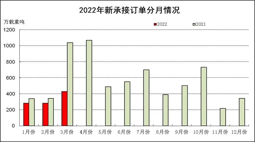 1~3月,全国造船完工961万载重吨,同比下降1.9%。承接新船订单993万载重吨,同比下降42.3%。3月底,手持船舶订单9910万载重吨,同比增长26.3%。