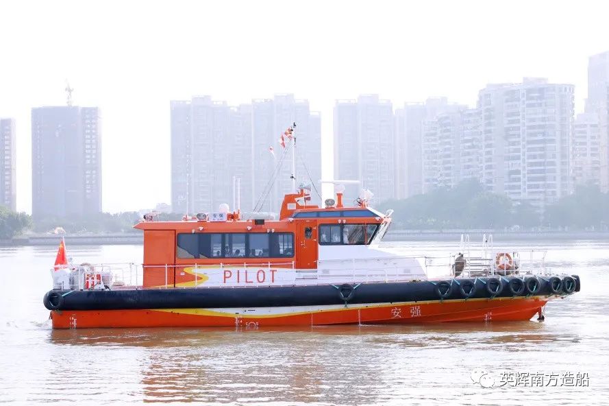 “安强”总长21.88米、型宽6米、型深2.85米,该船型是英辉南方在公司成熟母船型基础上,结合运营海域的特点,优化升级的新深V折角船型,具有优异的稳定性和良好的耐波性,船舶上层建筑采用整体弹性安装,大幅降低了船舱噪音,大幅提升船舶舒适度。同时配备了减摇陀螺仪、专业引航员悬浮减振座椅、登乘导轨等专业引航设备,为船舶提供更加专业的引航功能,为引航员安全专业的开展引航作业提供保障。本次航行试验充分验证了船舶的快速性、耐波性、稳定性、操纵性和舒适性,航速最高可达25节,超出合同要求3.8节,船舶质量和各项性能得到船东的肯定。