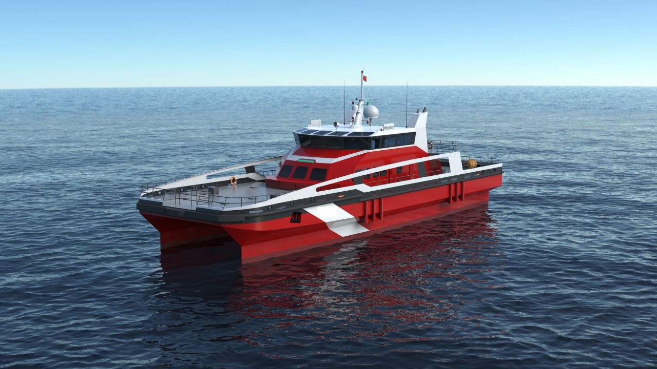 本船由中国船舶科学研究中心根据风电运维作业的特点精心研发设计,旨在为中国海上风电运维提供专业化、规模化的风电运维装备。在各类海况下具有优良的安全性、快速性和日常运营经济性。本船总长约38.5米,吃水3.0米,采用耐波性优异的小水线面双体船型(SWATH)和半滑差齿轮箱推进技术,可无级调速,实现四级海况安全可靠登乘作业、五级海况安全航行,年出航率超过80%,出航时间比现有常规运维船舶提高了1倍,靠桩时间缩短了一半。