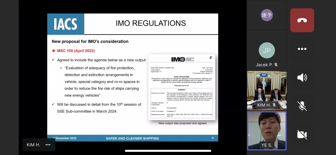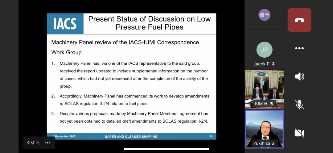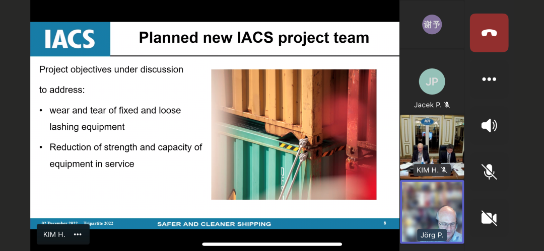 海洋安全议题,此次会议重点讨论了船舶低压燃料管系安全性、船舶系泊系统(集装箱缆绳)安全性等方面。IACS机械工作组主席Yukihisa Shibata发言表示,工作组计划对SOLAS公约中有关低压燃油管安全性的表述提出修订意见,包括防泄漏、防爆、防火、有效电子监控等方面内容,目前正在广泛搜集行业技术观点,计划在2023年开始,向IMO安全委员会及相关分工作组会议提供提案或评论。IACS船体工作组秘书长Jörg Peschmann发言指出,结合船东、货主以及保险公司的数据来看,集装箱船运输过程中出现的集装箱海损(遗失),主要原因中系泊缆绳质量低、系泊装置老旧化和系泊方式不合规占比明显,工作组将在该领域提出更多技术和标准建议。