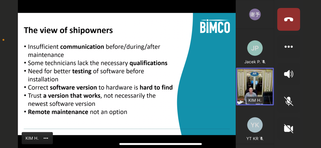 数字化技术及软件议题,就船舶设计、船上信息关系系统的数字化信息化技术新进展,以及国际业界对船舶应用数字化技术的建议等进行研讨。IACS的SOLAS工作组主席Duncan Duffy发言表示,目前船舶应用数字化技术仍面临许多障碍,除了数字化软件必须很好兼容船上各类不同设备系统外,还有船员是否能正确理解并正确操作信息系统,否则将对船舶安全造成重大影响。IACS网络系统技术专家AHN Jongwoo博士发言表示,IACS将进一步对船舶网络的数据安全、数据传输质量开展调研评估,目的是进一步研究完善相关行业标准,保障数据的可靠性和有效性,相关工作成果将提交IMO。国际航运公会(BIMCO)技术专家 Aron Sorensen发言指出,船舶使用数字化技术和软件,船东更关注实用性和成本问题,完整的售前演示、完善的售后服务体系(包括培训、维护),将有助于船东选择满意的数字化技术和软件产品。
