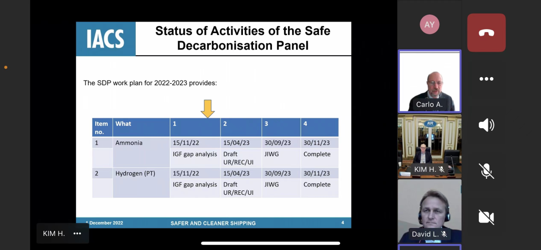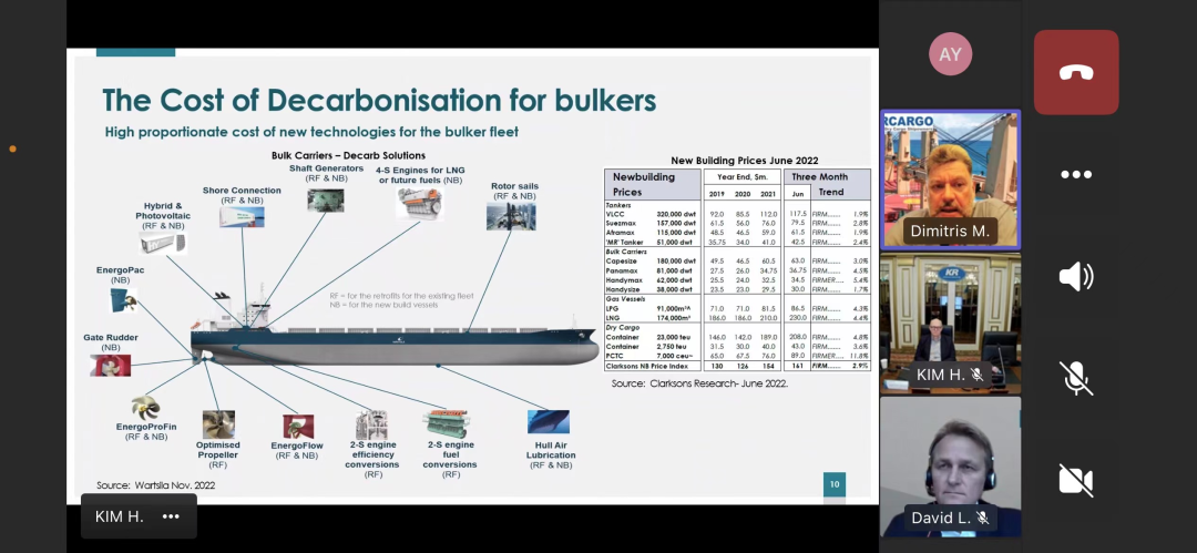 航运脱碳议题,就国际海事组织(IMO)的温室气体战略工作、航运业可持续发展、航运业脱碳技术的安全性等问题进行讨论。国际干货船船东协会(INTERCARGO)技术委员会副主席Dimitris Monioudis指出,航运业推进碳减排需要船东、造船、港口、配套等各方面的通力合作,尤其是在应用新燃料、新动力系统等减排技术方面,船东需要倾听更多来自船厂、设备方面的建议。国际航运公会(ICS)技术专家Chris Waddington表示,液氨、液氢等新绿色能源在船舶上的应用,将进一步催生绿色能源贸易、运输和港口设施(储运)建设,船东和航运业未来不仅要明确自身船队的能源定位,还要进一步参与绿色能源供应链的建设。国际船级社协会(IACS)安全脱碳小组主席Carlo Aiachini表示,液氨、液氢、电池和碳捕捉是目前安全性相对较高的碳减排技术方案,IACS将继续在这些领域向IMO安全委员会提供技术提案,支持IMO制定相应的碳减排行为准则,此外,目前IACS也已开始收集核能在航运上应用的技术建议。