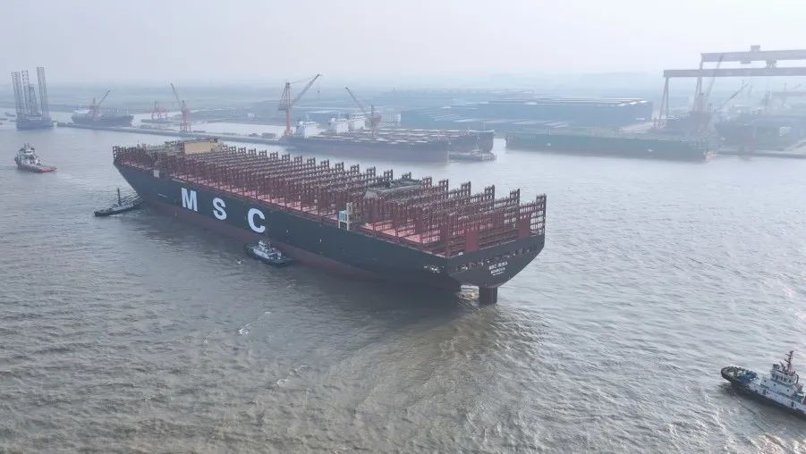 该轮总长399.99米,型宽61.3米,龙骨以上最大高度78.1米,甲板面积达24000平方米,相当于3.3个标准足球场,最大堆箱层数可达25层,相当于22层楼的高度,一次可装载创纪录的24346个20英尺标准集装箱,是名副其实的海上“巨无霸”和“带货王”。