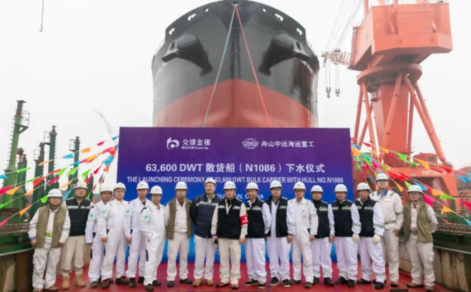 2月6日,舟山中远海运重工为交银金融租赁股份有限公司建造的8艘6.36万吨系列散货船首制项目在公司1号船台顺利上水,标志着该船从船台搭载阶段进入水下舾装阶段。