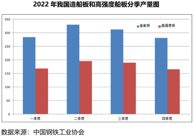 2022年,在我国造船用钢需求稳步回升的带动下,我国钢铁企业造船板产量大幅提高,月均产量回升至100.6万吨,达到近7年新高。统计数据显示,2022年,全国造船板产量1191万吨,同比增加283万吨,上升31.2%,其中高强度造船板产量696万吨,同比增加192万吨,上升38.1%。分季度来看,二季度和三季度造船板产量均超过300万吨。