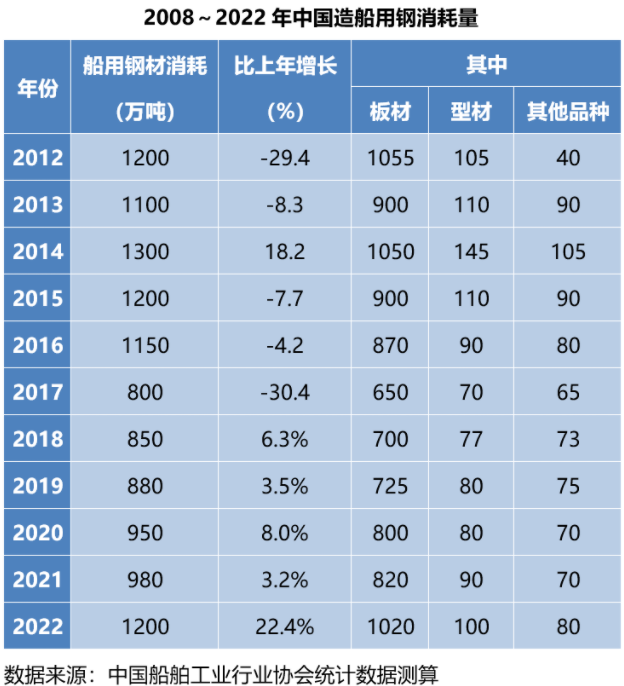 统计显示,2022年我国造船用钢总量超1200万吨,同比大幅增长22.4%,自2017年以来,造船用钢量首次回升至1000万吨以上。按品种来看,板材1020万吨,同比增长24.4%,型材100万吨,同比增长11.1%,其他品种80万吨,同比增长14.3%。