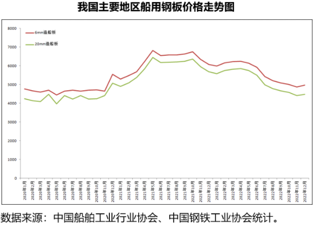 2022年,受国际大宗商品价格回落和国内钢铁需求不足等多重因素影响,国内各类型钢材产品价格持续下降,带动主要规格造船板价格呈现震荡下跌的走势。CIOPI62%直进月均价格从3月的150.83美元/吨,下降至年末的110.9美元/吨,下降幅度达26.5%。截至12月底,国内6毫米造船板和20毫米造船板均价分别为4960元/吨和4480元/吨,比年初分别下降17%和19.7%。