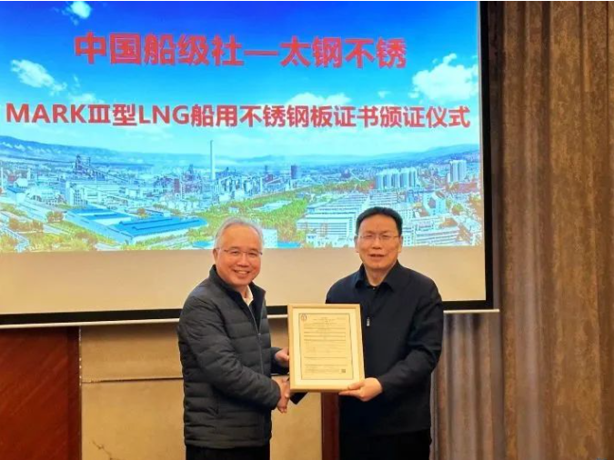 2月28日,中国船级社(CCS)为山西太钢不锈钢股份有限公司(简称“太钢不锈”)研发生产的MARK III型专用不锈钢板(简称“MARK III钢板”)颁发工厂认可证书。这是CCS签发的首张MARK III钢板工厂认可证书,太钢不锈也成为国内首家具备MARK III钢板生产能力和资质的企业。CCS副总裁范强、总部产品业务处负责人姜波涛和天津分社副总经理房涛,太原钢铁(集团)有限公司总工程师李建民等出席颁证仪式并进行座谈交流。