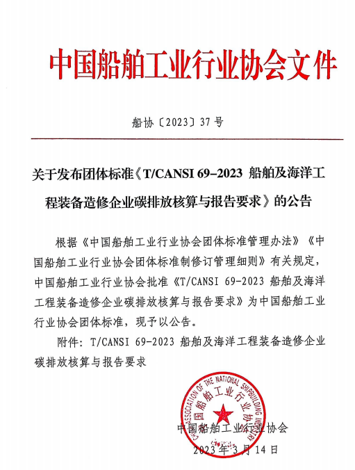 关于发布团体标准《T/CANSI 69-2023 船舶及海洋工程装备造修企业碳排放核算与报告要求》的公告