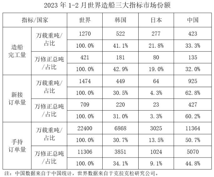 1~2月,我国造船完工量、新接订单量、手持订单量分别占世界市场份额的33.3%、62.8%和50.7%。