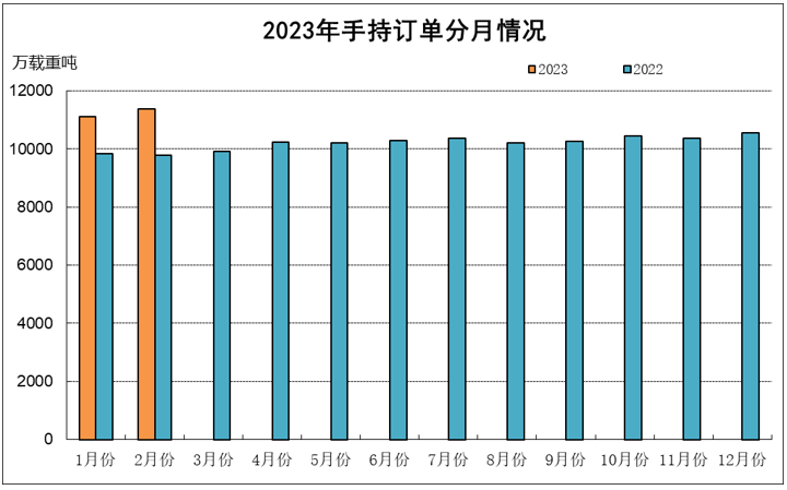 1~2月,48家重点监测造船企业造船完工383万载重吨,同比下降40.8%。承接新船订单925万载重吨,同比增长64.1%。2月底,手持船舶订单11057万载重吨,同比增长14.8%。