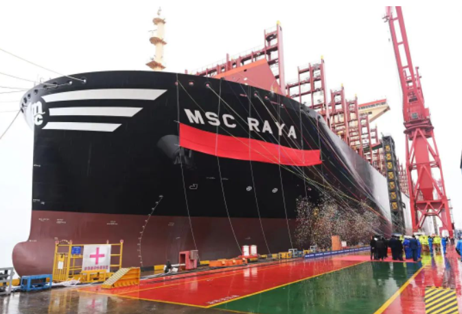 3月30日,中国船舶集团旗下江南造船联合中船贸易为交银租赁和瑞士地中海航运公司(MSC)建造的全球最大24100TEU级超大型集装箱船“MSC RAYA”号正式交付。