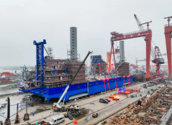 2023年4月19日,由中国船舶武汉船机总包的华夏金租神大01号1200T自升式风电安装平台顺利下水。