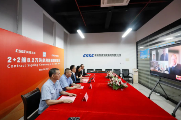 近日,中国船舶集团属下中船黄埔文冲船舶有限公司联合中国船舶工业贸易公司与挪威Grieg集团签署2+2艘8.2万吨多用途船建造合同,船东公司、中船贸易公司、黄埔文冲公司等单位领导共同出席此次云签约仪式。