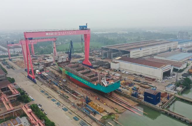 8月17日,装扮一新的全国首艘支线甲醇双燃料集装箱船在苏美达船舶有限公司公司新大洋造船顺利下水。