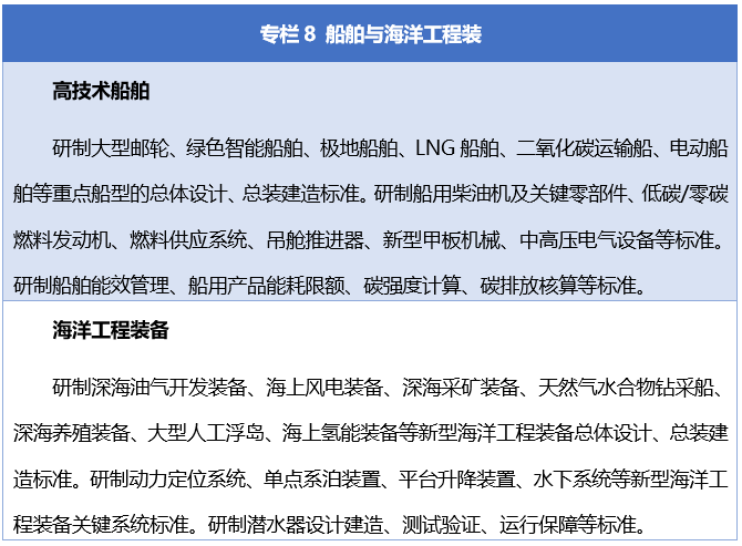 《实施方案》提出,全面推进新兴产业标准体系建设。聚焦高技术船舶领域,研制重点船型总体设计、总装建造标准,关键零部件和系统标准,以及绿色管理标准。聚焦海洋工程装备领域,研制总体设计、总装建造、关键系统标准,研制潜水器标准。