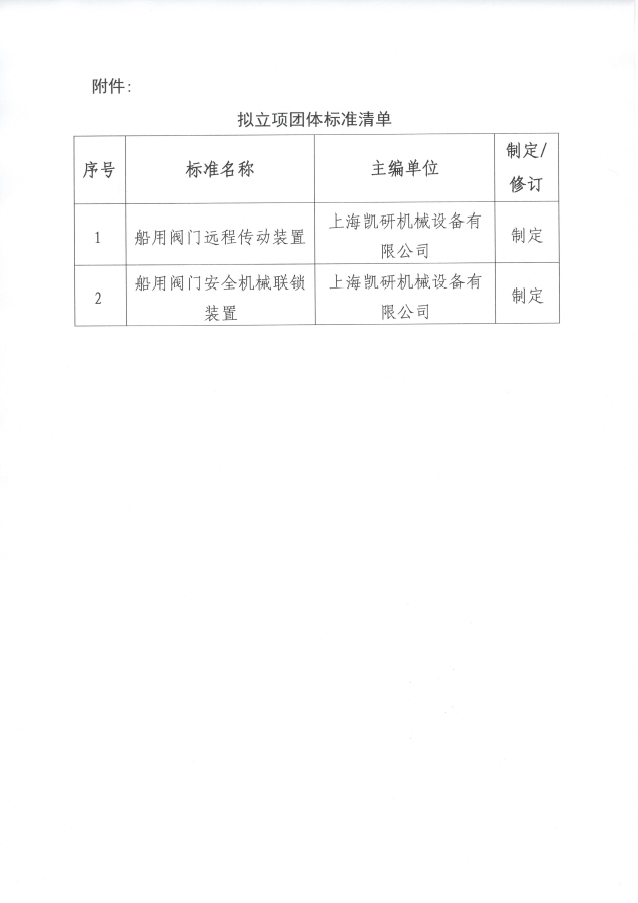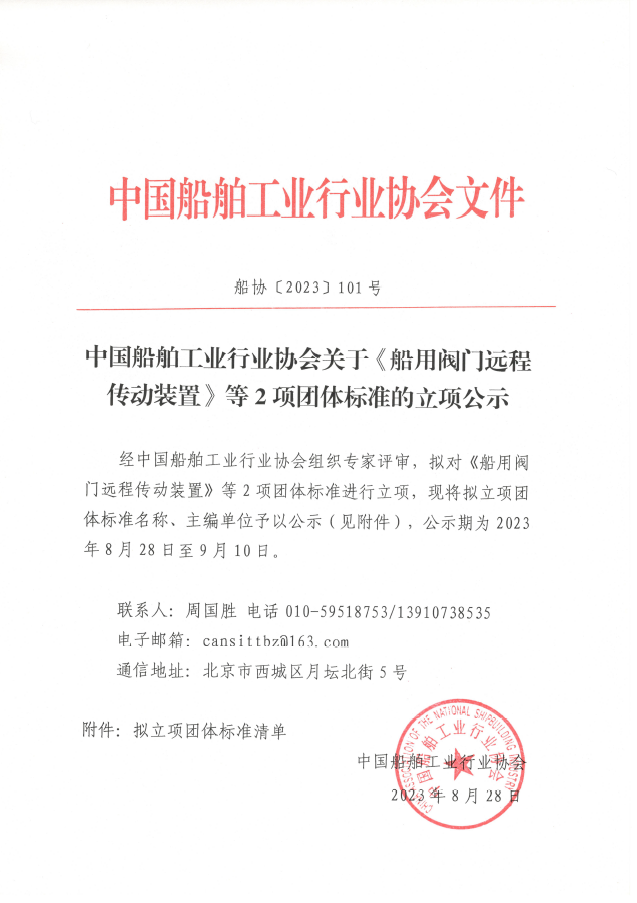 中国船舶工业行业协会关于《船用阀门远程传动装置》等 2 项团体标准的立项公示
