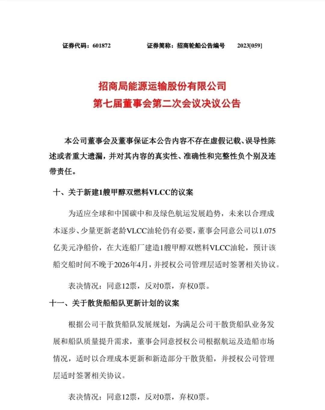 公告披露关于新建1艘甲醇双燃料VLCC的议案:为适应全球和中国碳中和及绿色航运发展趋势,未来以合理成本逐步、少量更新老龄VLCC油轮仍有必要,董事会同意公司以1.075亿美元净船价,在大连船厂建造1艘甲醇双燃料VLCC油轮,预计该船交船时间不晚于2026年4月,并授权公司管理层适时签署相关协议。