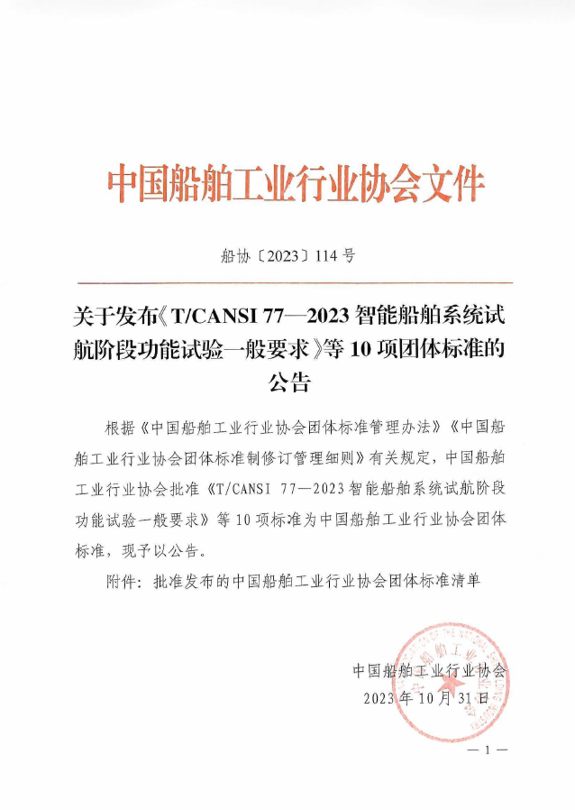 关于发布《智能船舶系统试航阶段功能试验一般要求》等10项团体标准的公告