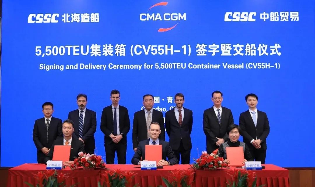 2月1日,中国船舶集团旗下中国船舶工业贸易有限公司与青岛北海造船有限公司作为联合卖方为法国达飞集团建造的1艘5,500箱集装箱船在青岛命名交付。