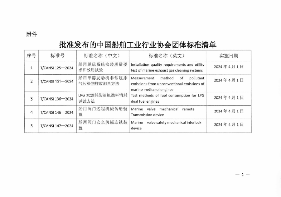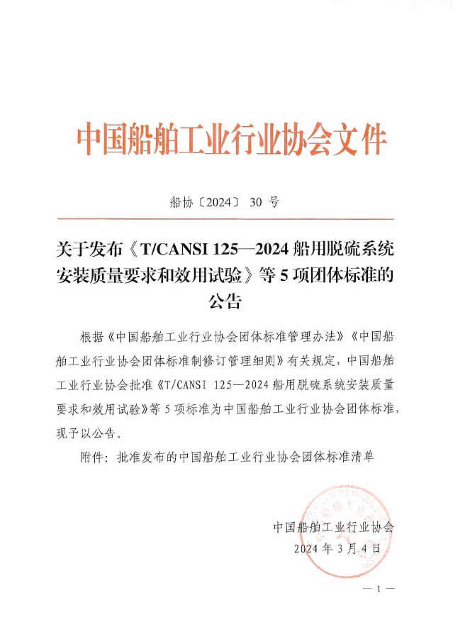 关于发布《T/CANSI125-2024船用脱硫系统安装质量要求和效用试验》等5项团体标准的公告