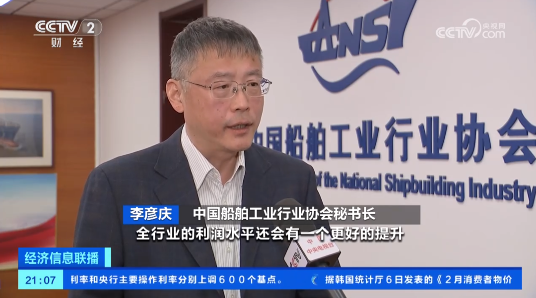 中国船舶工业行业协会秘书长 李彦庆:船价指数是创下了过去15年的新高,行业平均的利润率达到了4.2%,比去年涨了两个百分点。从今年明年后年这样一个预期来看,随着我们的高价船的交付,全行业的利润水平还会有一个更好的提升。