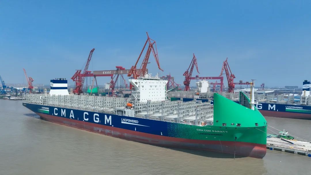 4月9日,由中国船舶集团有限公司旗下沪东中华造船(集团)有限公司联合中国船舶工业贸易有限公司为法国达飞集团建造的被誉为全球最新款清洁能源“海上绿巨人”13000TEU液化天然气(LNG)双燃料动力大型集装箱船系列3号船“CMA CGM PARATY”号,在中船长兴造船基地命名交付。这标志着南美洲东海岸航线又将新添一艘中国“智”造的大型双燃料动力集装箱船,也为达飞箱船船队持续壮大发展贡献了新的中国动能。