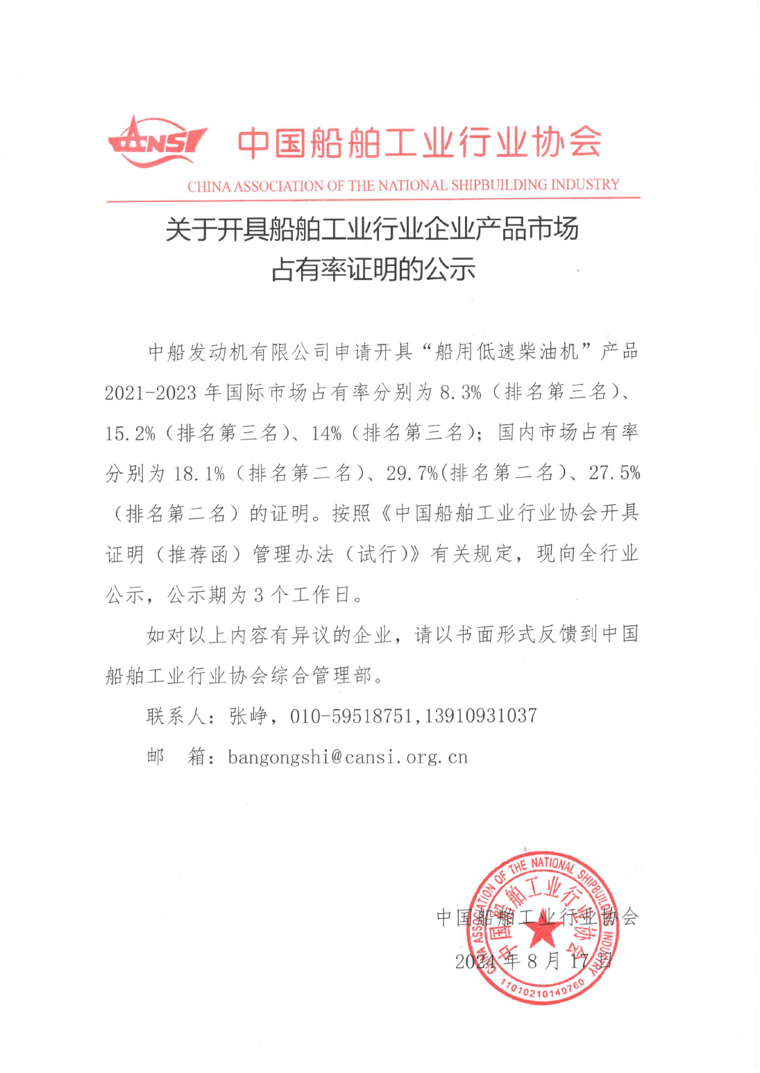 关于开具船舶工业行业企业产品市场占有率证明的公示
