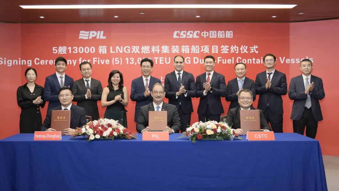 8月19日,中国船舶集团有限公司旗下沪东中华造船(集团)有限公司联合中国船舶工业贸易有限公司与太平船务有限公司正式签订5艘13000TEU液化天然气(LNG)双燃料动力大型集装箱船建造合同。这是继今年6月签订4艘14000TEU甲醇燃料预留大型集装箱船订单后,沪东中华承接的又一批大型箱船订单。至此,沪东中华已累计完工和手持大型集装箱订单近百艘,位居全球各大船厂前列,持续巩固其在超大型、大型集装箱船建造领域的领军地位。