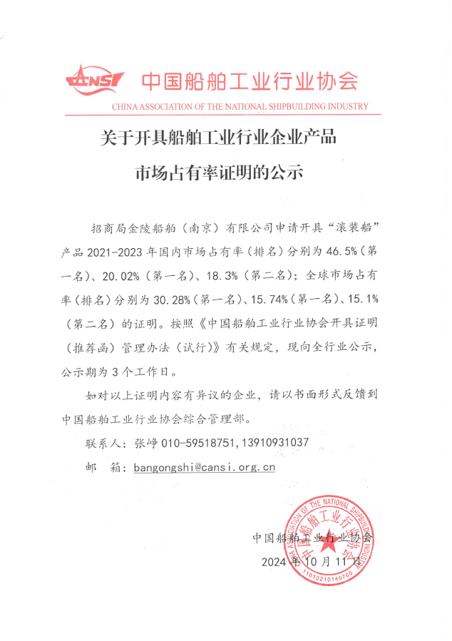关于开具船舶工业行业企业产品市场占有率证明的公示