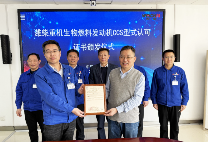 今日,中国船级社(CCS)青岛分社向潍柴重机股份有限公司颁发了WH25、170 B100生物柴油船用发动机型式认可证书。青岛分社副总经理高学廷与潍柴重机有限公司总经理尹晓青等领导出席颁证仪式。