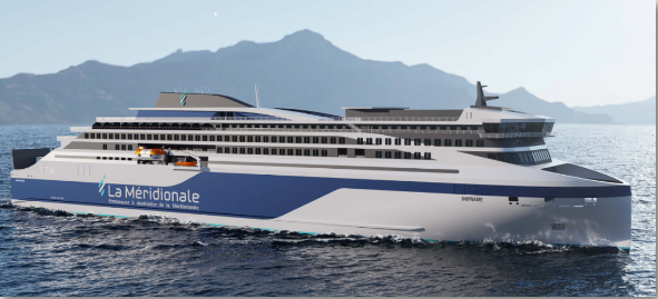 W0281船总长180米,宽30.8米,设计吃水7.0米,航速21.6节,可搭乘932名乘客以及68名船员,配备四台发电机、两台艏侧推、两个450立方米LNG储存罐以及13兆瓦的大容量电池包。该船采用MGO+LNG双燃料动力系统,结合电池推进和岸电系统,同时,配备吊舱推进单元,取代传统轴舵系,有效释放舱室空间,无齿轮电驱减少了机械传动的能耗损失,吊舱外置降低了噪声干扰,极大满足新一代高端客滚船对环保性、经济性、安全性以及灵活性等核心需求。该船交付后将行驶于法国马赛港及科西嘉岛各港口。