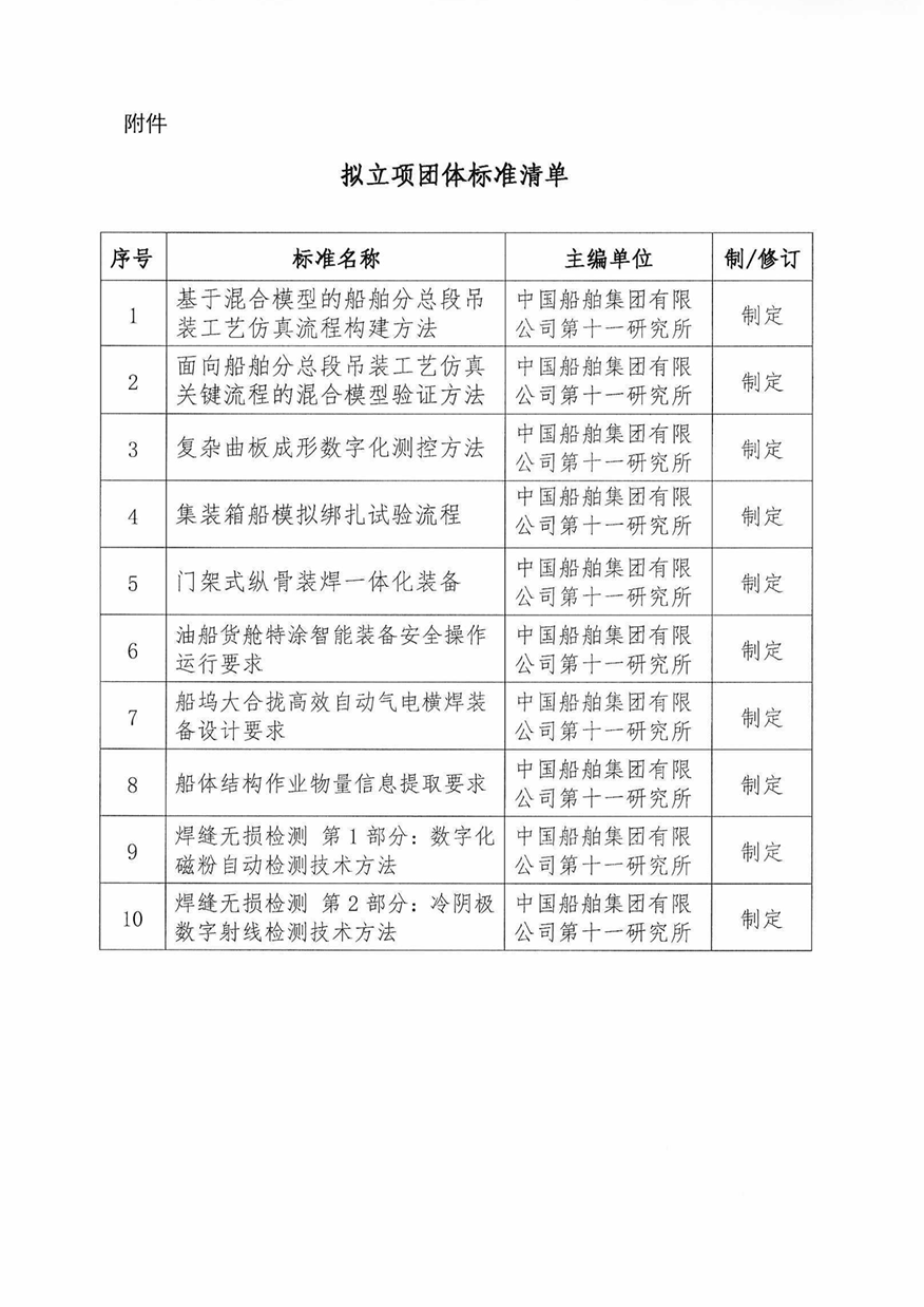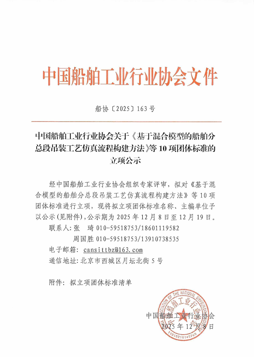 中国船舶工业行业协会关于《基于混合模型的船舶分总段吊装工艺仿真流程构建方法》等10项团体标准的立项公示