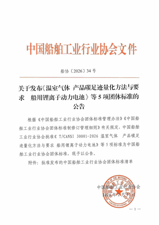 关于发布《温室气体产品碳足迹量化方法与要求 船用锂离子动力电池》等5项团体标准的 公告