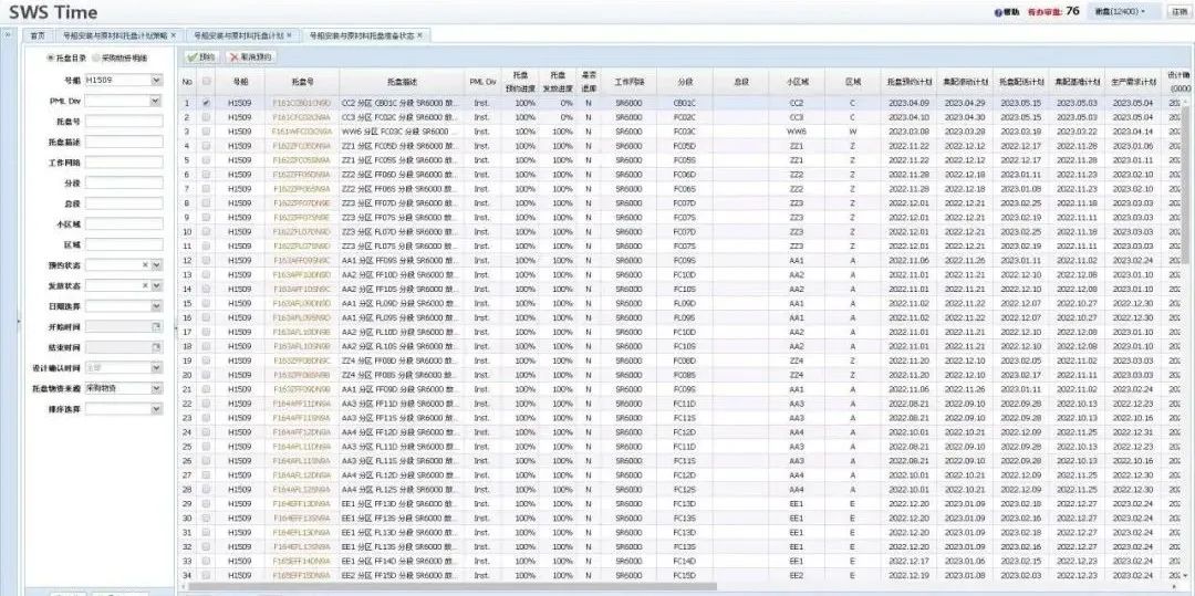 围绕公司生产准备管理体系,集配部、信息部、生产管理部、民海项目部、邮轮项目部、设计一部等联合策划推进“民/海/邮托盘计划”信息管理系统,打造以民/海/邮为对象的TIME物资托盘集配计划管理信息平台。经过前期大量的调研分析、需求策划、开发测试、培训等工作,“民/海/邮托盘计划”信息管理系统于6月初正式全面上线应用。目前系统已在大型邮轮、集装箱船、散货轮、油轮等实船开始应用,基本构建公司安装托盘/原材料托盘计划自动生成策略。