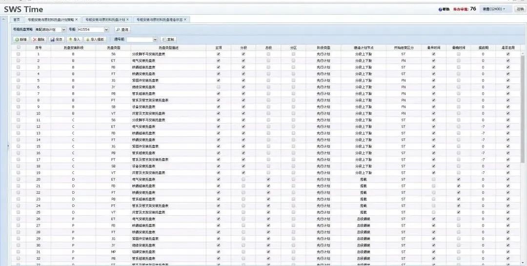 现场计划调整频繁等问题给民/海/邮托盘计划管理带来很大影响,项目组借鉴邮轮托盘物资计划自动生成策略模式,以分段总段建造计划为基准,将民海托盘物资通过托盘类型、安装阶段、建造计划节点自动计算出托盘物资托盘计划,实现民/海/邮托盘集配计划全部纳入系统自动生成,提高部门计划管理效率,减少计划错误的产生。